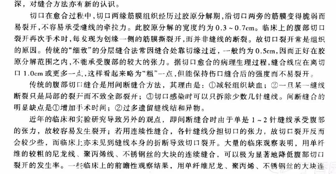 重点是将腹白线对合,切忌将腹膜卡在腹白线上。腹膜卡在腹白线,将影响愈合。术口愈合过程,在切缘有胶原分解,也就是组织水肿,胶原分解的宽度在切缘约 0.3-0.7 cm,在这个范围内组织承受张力差,容易撕裂。