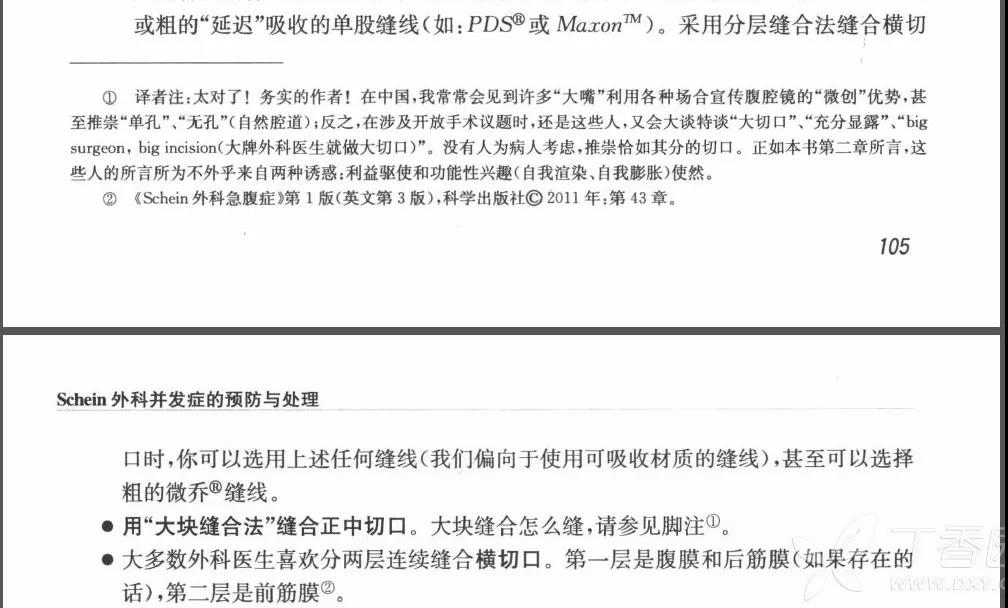 在《Schein 外科并发症的预防与处理》也推荐正中术口,大块缝合。截图如下: